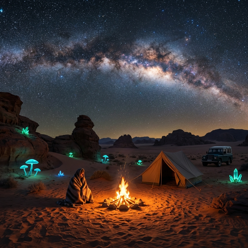 "수억 개의 별들이 쏟아지는 은하수가 장엄하게 펼쳐진 사막의 밤하늘 아래, 따뜻한 모닥불 옆에서 텐트를 치고 담요를 두른 채 별을 바라보며 커피 한 잔의 여유를 즐기는 여행자의 로맨틱하고 평화로운 캠핑 장면"
