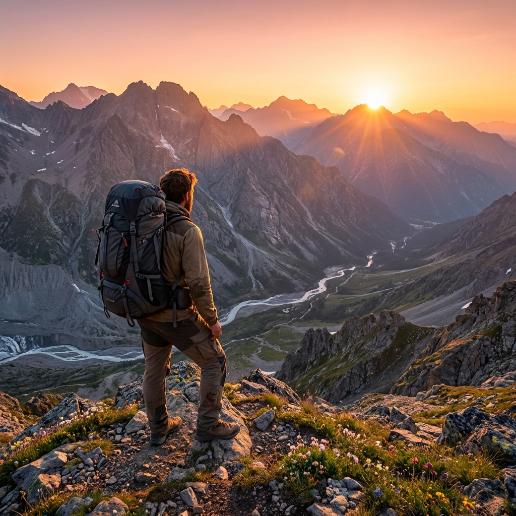장엄한 알프스 산맥의 일출을 배경으로 등산 배낭을 메고 바위 정상에 서서 구불구불한 계곡을 내려다보는 여행자의 숨막히는 모험 사진